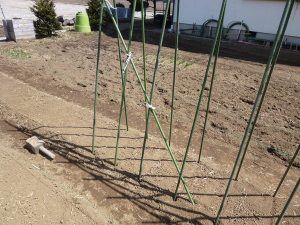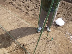 2対の支柱を32cm間隔で埋めていきます。この畑では14対の支柱を埋めました。