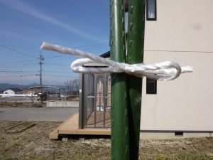対となる2本の支柱の上部をビニール紐(60cm)で巻き結びします。