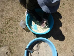 次に、おからを細かくしながら先ほどの米ぬかと籾殻燻炭に混ぜます。