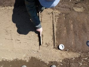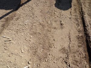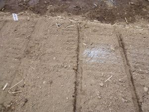 溝に1cm程度の間隔で小松菜の種を蒔きます。