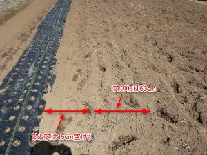 畝は1つ60cmの幅で作ります。写真のように紐を張って畝の位置決めをします。