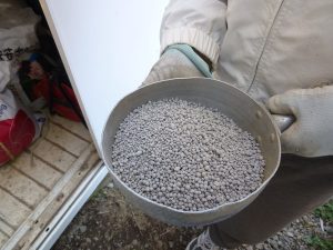 前回の収穫が終わった畑は酸性化しています。苦土石灰を撒いて中和します。