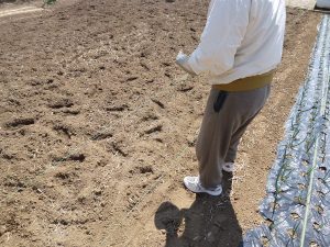 野菜作り次の野菜を植えるための畝(うね)づくりをします。