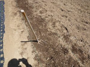 最後に4本鍬で土を耕して石灰が混ざるようにします。この後1週間程度放置して、土壌が中和するのを待ちます。