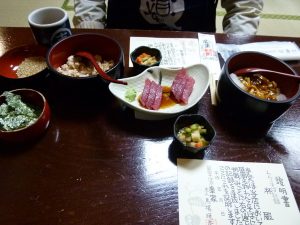 4月22日の午後から地元を出発して、高速道路を走ること3時間、福島県内の安達太良(あだたら)サービスエリアのレストラン「お食事処あだたら亭」で夕食を取りました。ここでは、伊達鶏五目わっぱそばセットを頂きました。