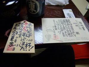 1杯目は、薬味を入れずに食べるのが作法のようです。一口ほどの量なのですぐ食べられます。1杯食べ終わると、お給士さんが次のお蕎麦を投げ入れてきます。あとはひたすら食べるだけです。50杯ぐらいまでは余裕でしたが、80杯を超えるときつくなってきます。90杯でお腹いっぱいになったのですが、ここまできたのでなんとか100杯食べて終了。もう、何も入りません。食べ終わると、お給士さんが証明書を書いてくれるのですが、100杯を超えると証明手形も頂くことができます。