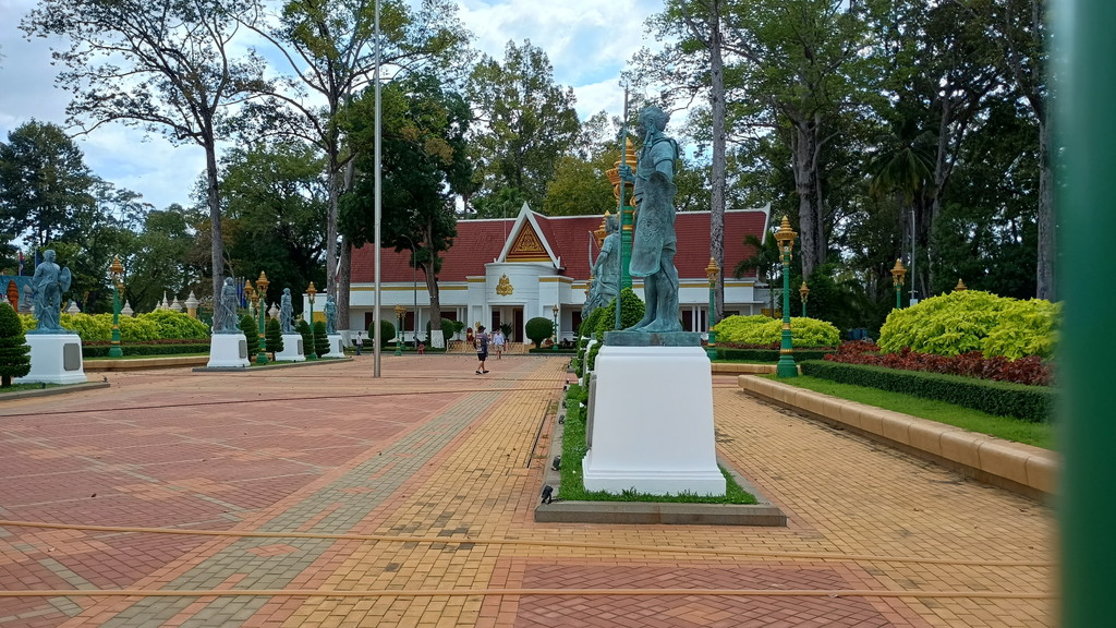 博物館からの帰りは徒歩で戻りました。外は大分暑かったのですが、ホテルまでは2km程度なので頑張りました。雨も全く降る様子がありません。途中、「ロイヤルインデペンデンスガーデン」やシェムリアップ川の景観を楽しみました。ロイヤルインデペンデンスガーデンは、国王の別荘「ロイヤルレジデンス」の真向かいにあり、景観の良い公園として整備されています。