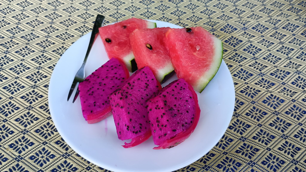 果物はスイカとドラゴンフルーツです。昨日も書いたのですが、甘みと酸味のあるドラゴンフルーツが個人的に大変気に入りました。日本で買うのは中々難しそうなので、記憶に残るように噛みしめながら頂きました。