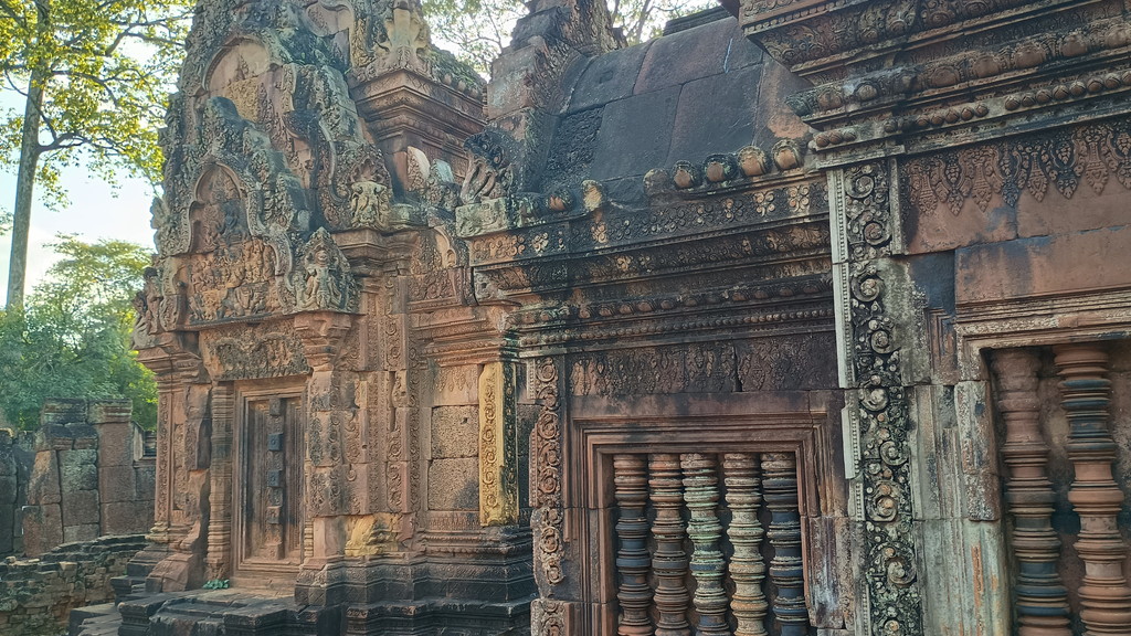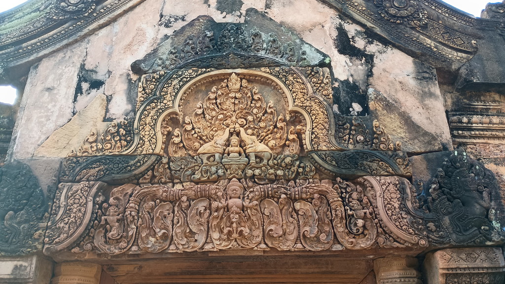 開口部の上に山形の装飾を、破風(はふ)と言います。ちなみに、これまでいくつかの遺跡で見てきた長方形の装飾はまぐさ(リンテル)と呼びました。彫刻は精緻の極みに達しており、他の遺跡と比べても頭一つ抜けている印象です。赤色砂岩は通常の砂岩よりも硬いため、このような細かい装飾が可能なようです。