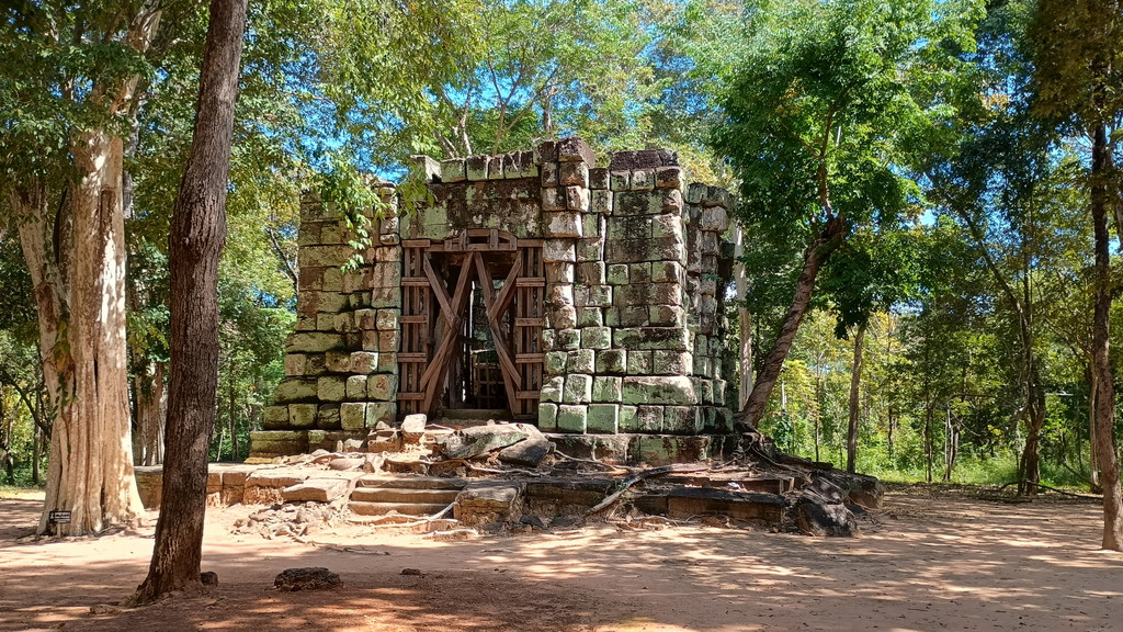 ベンメリアは三重の回廊に囲まれ、その中に、十字型の中庭などの伽藍配置を取ります。参道を歩いて、まず見えてくるのが一番外側の第三回廊の西門です。ご覧の通り、入口付近は崩壊しているため通ることはできません。