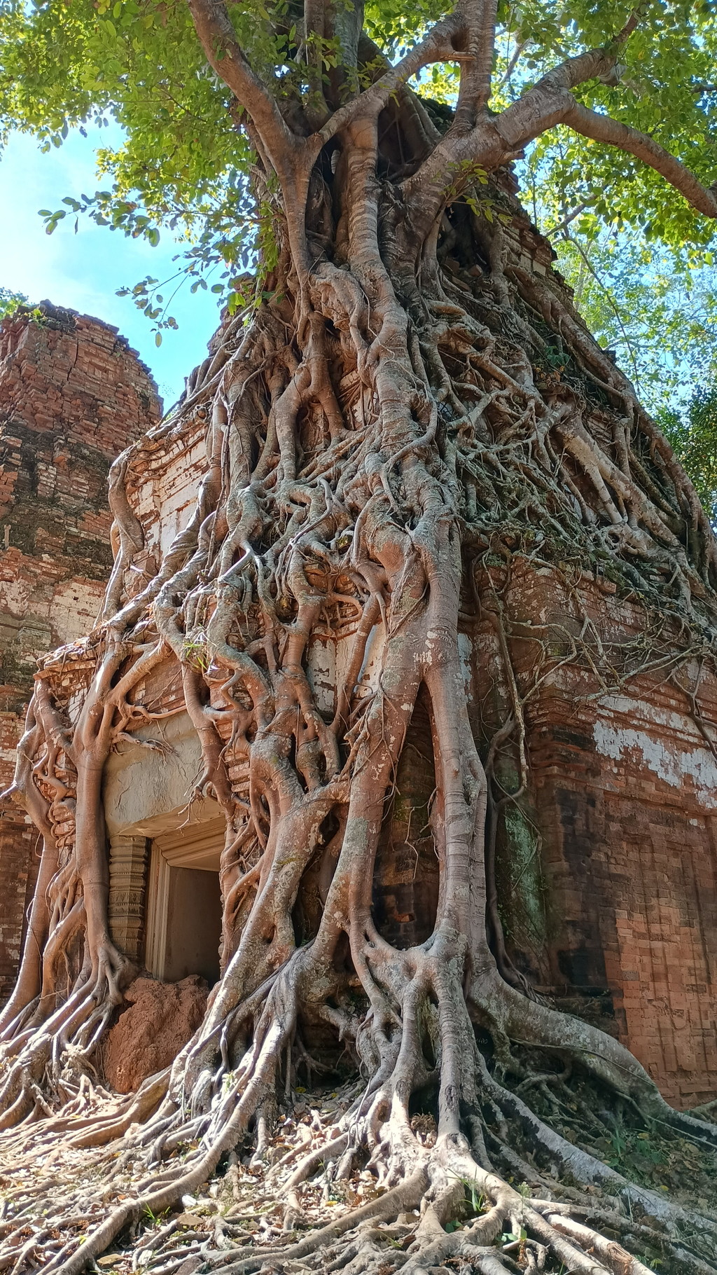 こちらの一番の見どころは、右手前にある祠堂で、大樹の根が毛細血管のように絡みつく様子です。タ・プロームでも同じような景観がありましたが、こちらは毛細血管という言葉がふさわしいほどの複雑な根の絡みようです。この場所は大人気で、我々も含めた全員が代わる代わる写真撮影をしていました。