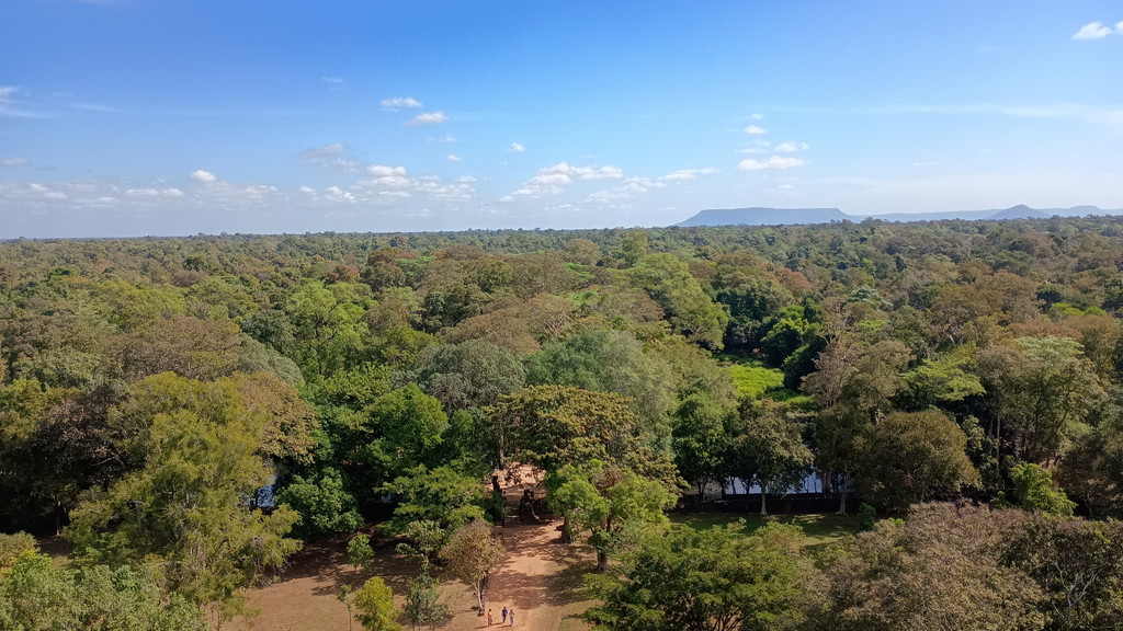 頂上からは360℃見渡す限りジャングルで、遥か遠くまで見渡すことができます。カンボジアの国土が如何に平坦かを実感できます。密林の緑と青空のコンストラクトも素晴らしいです。一見、周囲一帯はジャングルで何もないように見えるのですが、ガイドさんが言う通り、良く見ると所々にわずかですが集落を見つけることができます。
