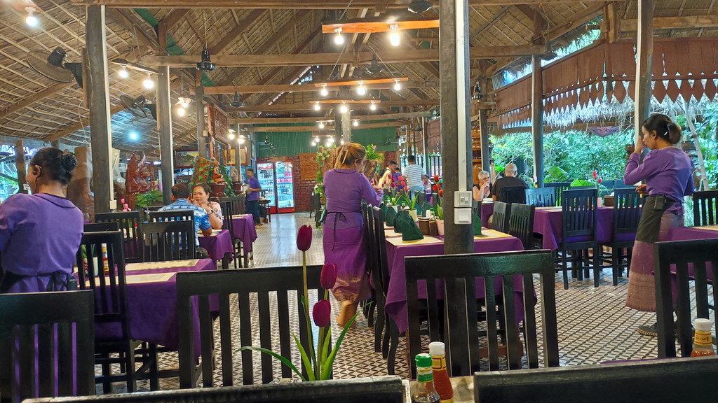 建物はオープンテラスで、屋根はヤシの木でしょうか?お昼の時間帯からは大分過ぎていたので、レストランの中は空いていました。トイレは一見綺麗ですが、結構蚊が飛んでいるのが気になりました。お昼の時間帯は繁盛しているようで、大勢のスタッフがおり、着ている紫色の衣装が目を引きます。これはカンボジアの伝統衣装でしょうか?