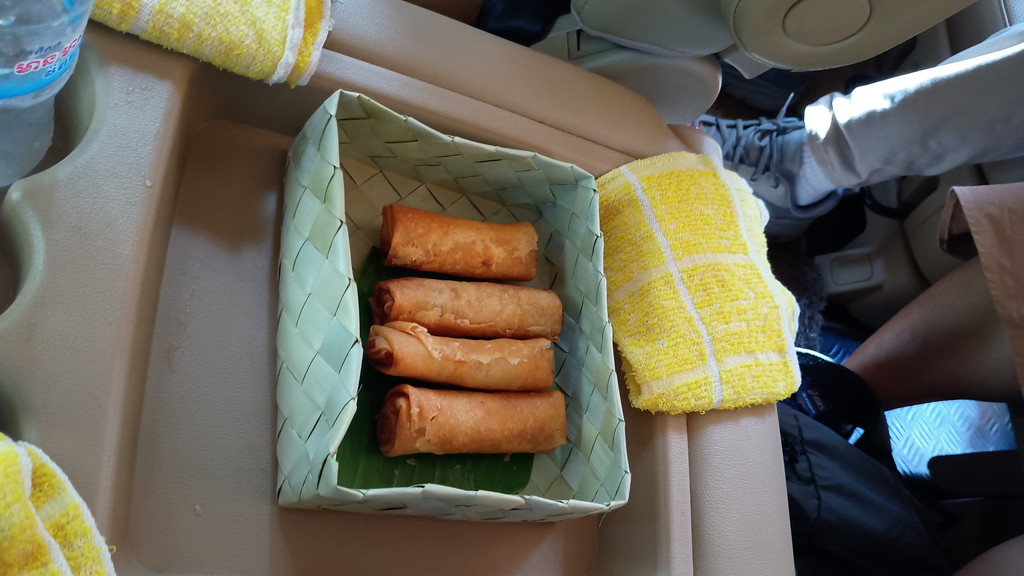 車に戻ると、冷たいおしぼりと春巻きのサービスがありました。春巻きは日本で食べるものに近く、甘めの味付けで美味しかったです。スケジュール上、昼食はベンメリアを見学した後になるため、軽くお腹に入れることが出来るように配慮してもらったようです。