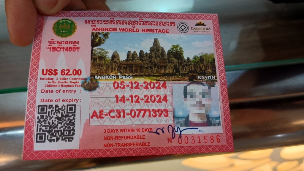 このツアーはチケットオフィスの訪問から始まります。アンコール遺跡群の観光には、アンコールパスと呼ばれる入場券が必要です。一部の例外はありますが、このアンコールパスがあればほぼすべての遺跡に入場することができます。入場券の種類には1日券(37ドル)、3日券(62ドル)、7日券(72ドル)の3種類があります。3日券と7日券は有効期間内に使えば良く、連続して3日間(7日間)で使う必要はありません。なお、アンコールパスはシェムリアップ中心部から約5km離れたチケットオフィスのほか、ネット購入することが可能です。