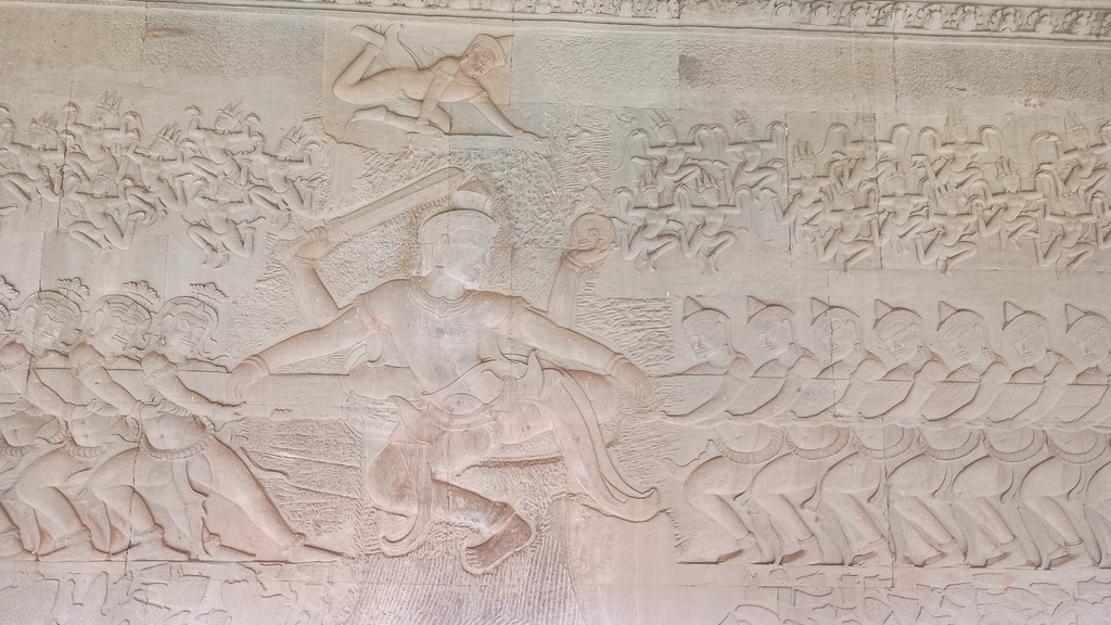 最後は第一回廊のレリーフを鑑賞します。アンコール・ワットの中でも大変見応えのある場所となっていますが、時間の制約でしょうか、このツアーでは一部の「天国と地獄」と「乳海攪拌」を鑑賞するに留まりました。個人的にはレリーフはじっくり鑑賞したかったので残念ではありましたが、こんな流れになることを予想していたので、明日もアンコール・ワットを個人で再訪するスケジュールを組んでおきました。