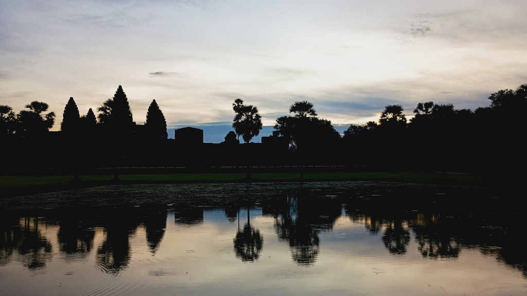 アンコール・ワット周辺は灯りの類がなく真っ暗でしたが、周囲からは多くの観光客の声が聞こえてきます。思った以上に日本語を話している人が多かったのが意外でした。ここに来る途中、日本人を全く見なかったので、プノンペン経由で来る人は少数派なんでしょうか?朝日を鑑賞するにあたって、良い場所は競争になるらしいので、何処も寄り道せず真っ直ぐに鑑賞ポイントに向かいます。昨日から分かっていたことではありますが、今日は曇り予報だったので、朝日を見ることは出来なさそうです。ガイドさん曰く、曇っていても幻想的で素晴らしいと仰っていたので、それを期待します。