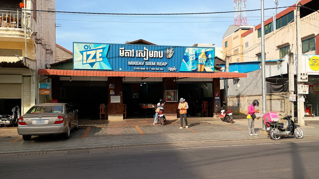 ホテルでしばらく休憩後、遅めの昼食に出かけました。朝にご飯を食べてしまったので、お昼は麺類が食べたい気分になり、事前にピックアップしておいた「Mikeav Siem Reap」という麺料理のお店に行って見ました。いつも混んでおり、地元の方にも人気のあると評判のお店です。ホテルからは約700mの距離にあります。暑さがピークの時間帯だったので、歩くには少し距離があったのですが、何とか頑張って向かいました。