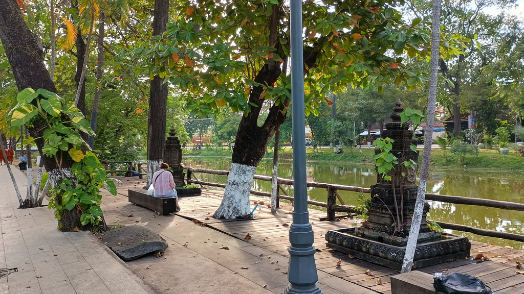 ホテルからこの辺に来るまでは、お寺の名前を冠した「ワットボー通り」を歩いて来たのですが、帰りはシェムリアップ川沿いの遊歩道を歩いてみました。緑豊かな景観は相変わらず素晴らしく、各所には休憩するためのベンチやモニュメントなどが配置されており、良く整備されているのが伺えます。シェムリアップは観光客が多い場所ではあるのですが、日中は皆さん遺跡の方に行っているのか、割と閑散としており、静かなのも気に入りました。