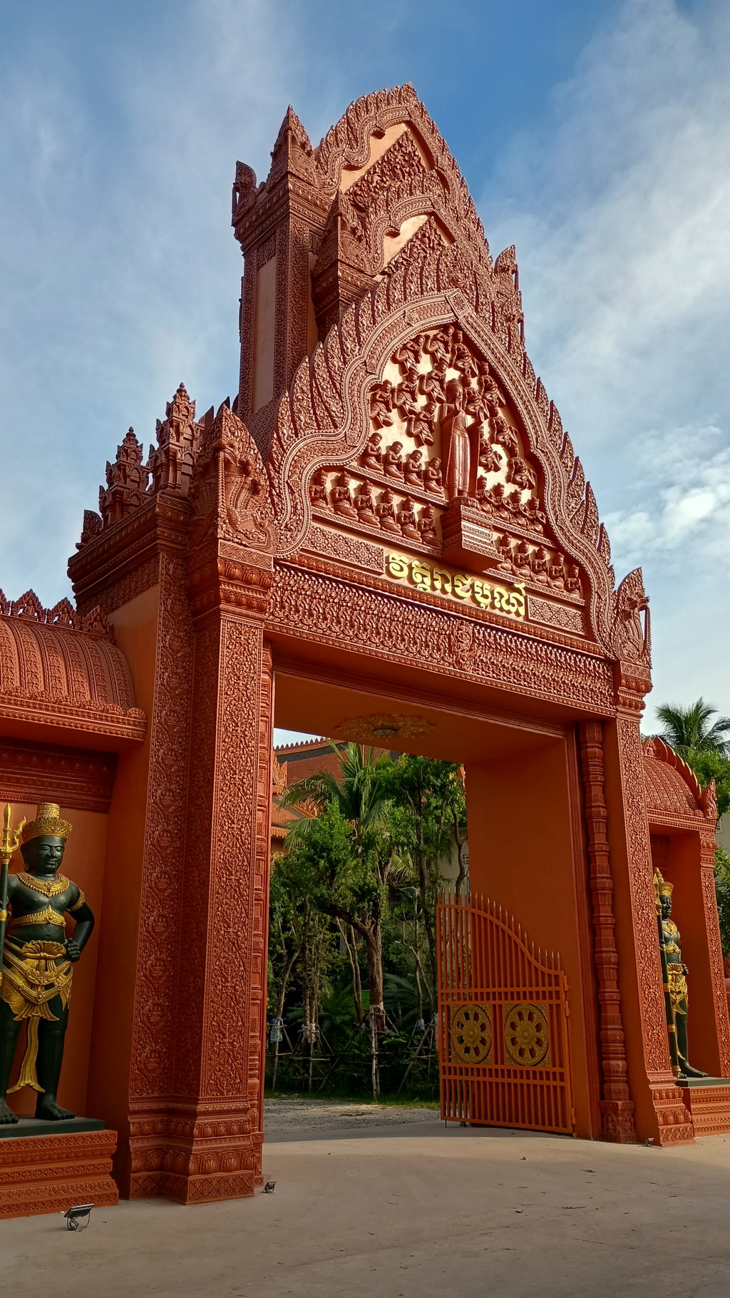 入口は大変立派で、赤と茶色の中間のようなカラーリングが独特な印象を与えます。そういえば、プノンペンの国立博物館もこんな感じでしたね。