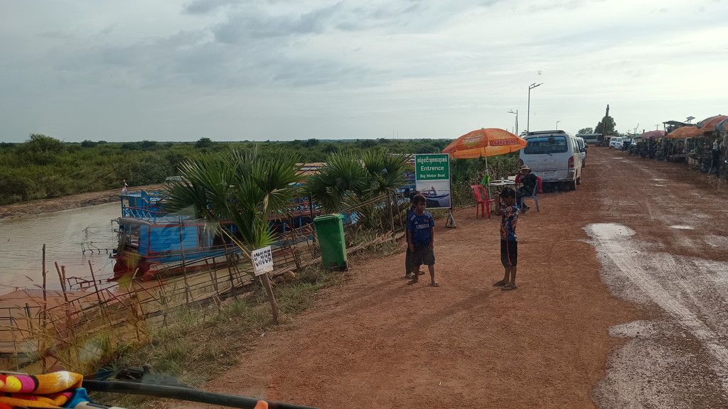 コンポンプルックはシェムリアップから南東約20kmの位置にあります。バスは国道6号線をしばらく東に進んだ後は、湖に伸びる脇道に入りました。道路は舗装がされておらず、赤土に覆われたガタガタの道が続きます。綺麗に舗装されている国道6号線との落差の大きさに驚かされますが、周辺の家屋も粗末な作りのものが多く、実はこれが本来のカンボジアの姿なのか?と考えさせられるものがありました。