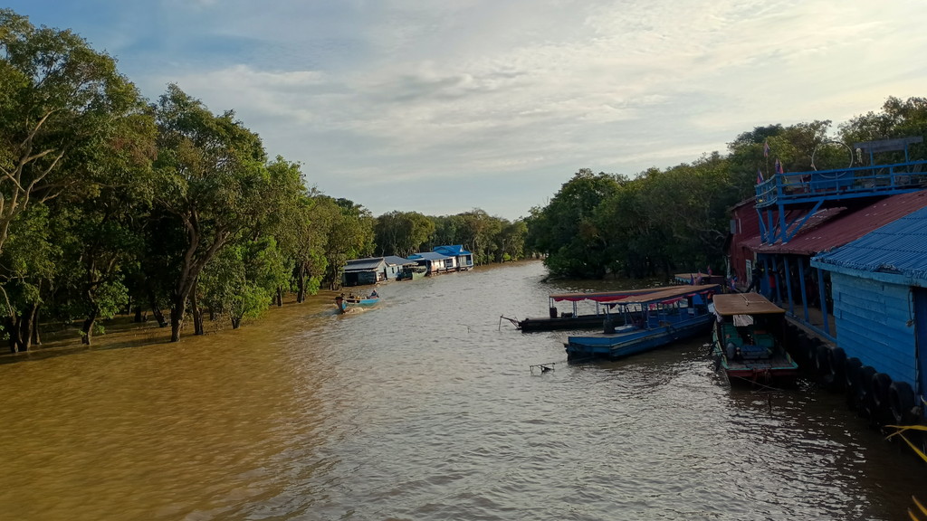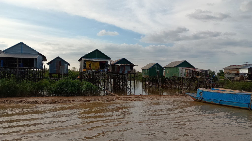 ボートはトンレサップ湖に繋がる川を下ります。下ると表現しましたが、ほぼ平坦なので上下の概念はないのかもしれません。Googleマップによるとタハスという名前の川のようです。。川の表面は泥水で景観はあまりよろしくありません。これは水位が下がる乾季だからなのか、先日降った雨の影響なのか、それとも年中このような状況なのかは分かりませんでした。