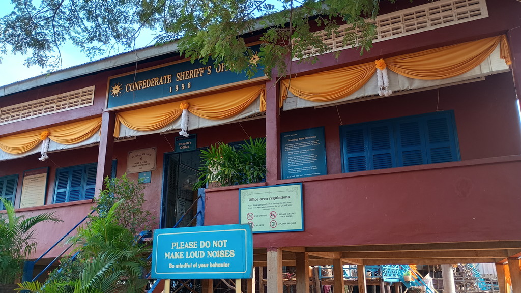 行政機関のような建物もありました。看板の表記をそのまま日本語にすると南部保安官事務所になるので、軍か警察関係の建物かもしれません。無国籍と言っても4,000人も住んでいれば、公的な建物があったりするのは当たり前のことで、思った以上に村としての体裁が整っていると感じました。ちなみに、スマホの通信状況は良好で問題なくネットが使えました。