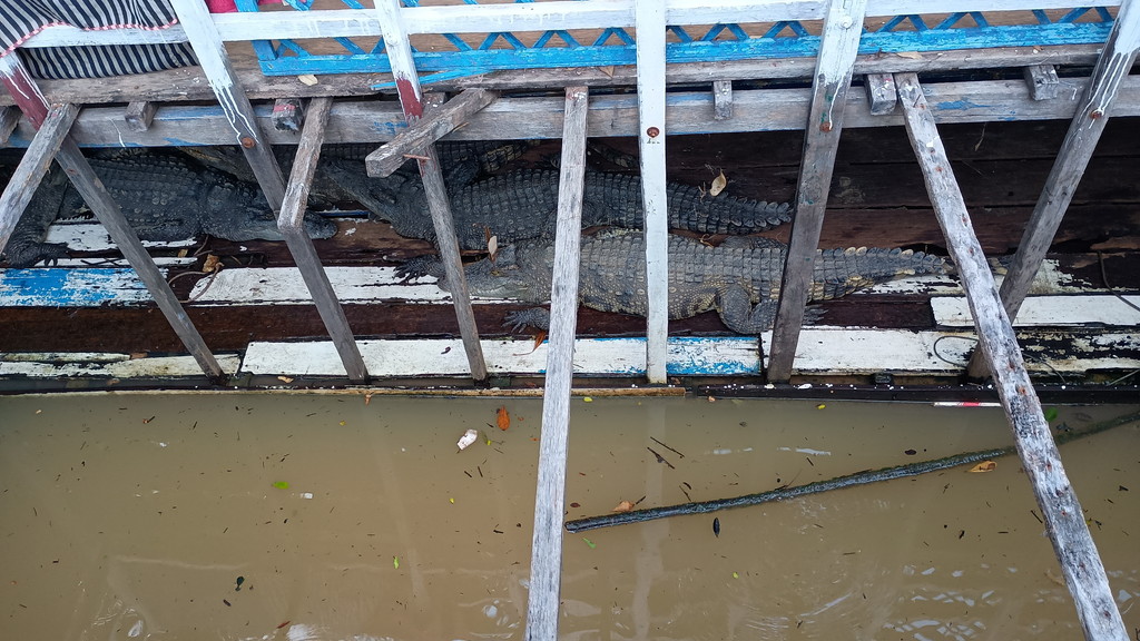 ボート乗り場の建物にはレストランが併設されており、こちらでしばらく休憩となりました。周りの方を見ると、何かしら飲み物を頼んでいるようなので、私も缶コーヒーを頂きました(1.5ドル)。また、ワニを飼育しているスペースがありました。かつてトンレサップ湖では野生のワニが生息していたようです。