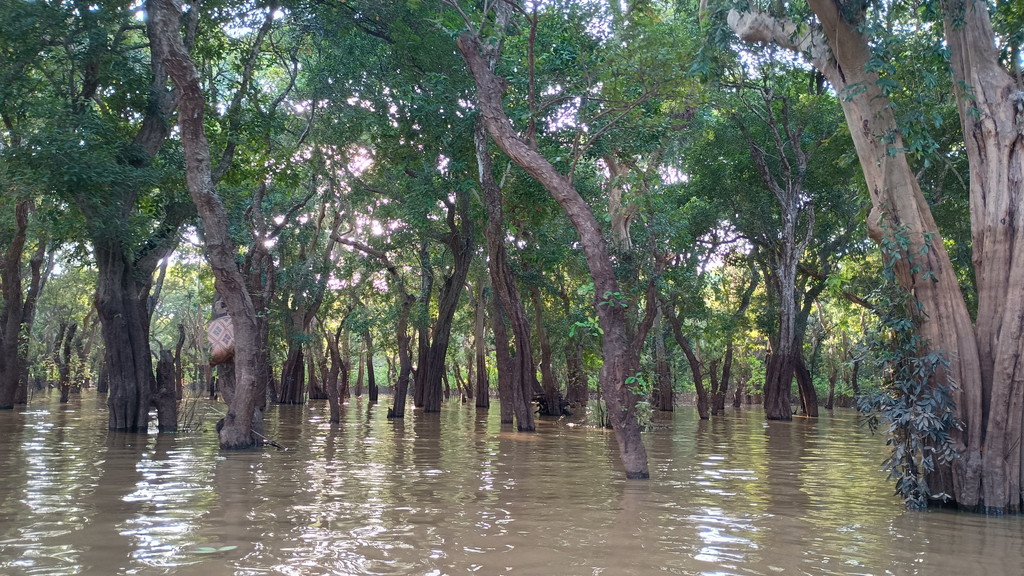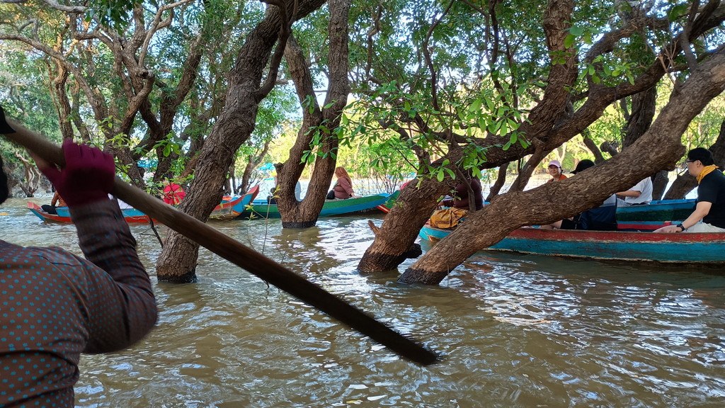 ボートで数分進むと、水上集落が無くなり、代わりに木が密集しているエリアが見えてきました。これがマングローブ林で、「マングローブ」は地名ではなく、熱帯・亜熱帯の汽水域に成立する森林を指す言葉のようです。汽水域とは淡水と海水が混合する部分とありますので、トンレサップ湖は若干の塩水が混じっていることになります。淡水湖なのに塩水が入っているのは不思議なんですが、少し調べても理由は良く分かりませんでした。