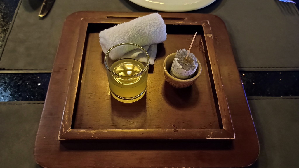 注文を終えると間もなく、冷たいおしぼりと飲み物、お通しが運ばれてきました。飲み物は、お茶だったのかフルーツジュースだったのか記憶が定かではありません。お通しはゼリー状のものでしたが、甘くて美味しかったような記憶があります。