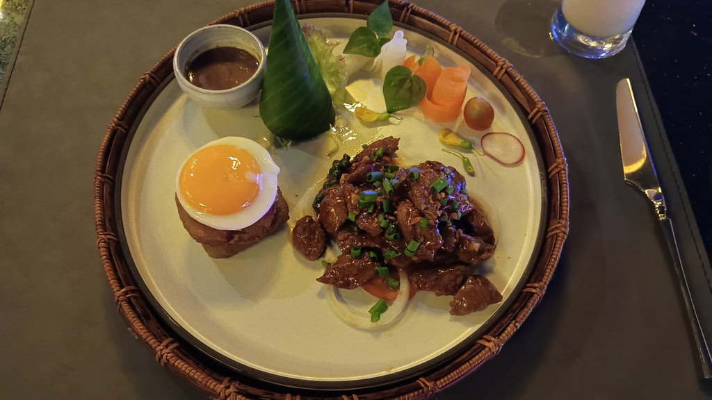 メインディッシュはロックラックです。相変わらず見事な盛り付けですが、ロックラック自体も柔らかい牛肉で食べ易かったです。一番印象的だったのは胡椒ソースで、これが大変絶品で、これだけでもこの料理を食べた価値があります。同じ胡椒でもこんなにも違うのだなぁと感心しました。