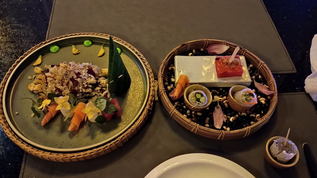 ダンスショーは19時半から21時半の2時間、約20分間隔で計5演目行われました。1つ目の演目が終わったタイミングで、前菜が運ばれてきました。盛り付けが大変美しく、見た目の趣向が凝らされていますね。こんなにお洒落な見た目の料理を頂いたのはいつ以来でしょうか?記憶にありません。内容としては、春巻き、スイカ、揚げたお米でした。春巻きは、揚げたタイプのものではなくて、野菜やエビなどが入ったしっとりとした方のものです。上品な味付けでした。揚げたお米はパリパリで食感が良く、他にも蓮の種やココナッツ、果物も入っているようで、これらとの相性も良く甘くて美味しい食べ物でした。スイカにも何かが乗っているようで、一工夫してありました。