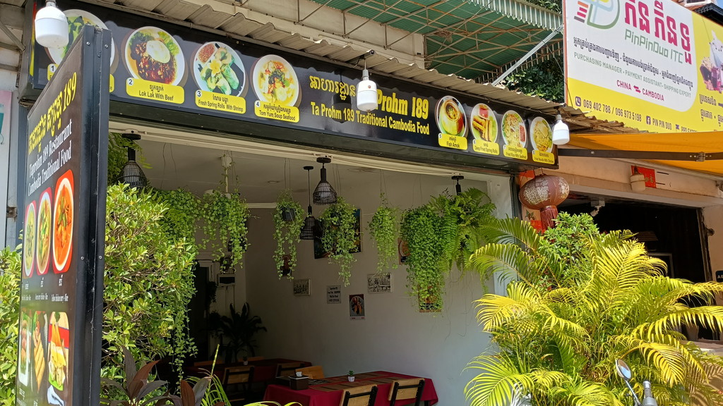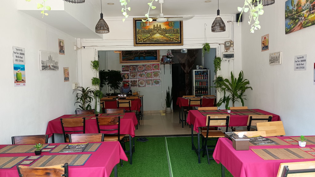レストランはホテルから約200m、徒歩で5分も掛かりません。この時間帯はシェムリアップ市内には観光客は少ないようで、お昼の少し前に行ったのですが、お客さんは誰もいませんでした。リーズナブルにカンボジア料理が食べられるお店という情報だったので、失礼ながら大衆食堂のようなお店をイメージしていたのですが、建物自体は大きくはないものの、レストランとしての体裁が綺麗に整えられており、内装は絵が掛けられていたり、お洒落な音楽を流すなど工夫が凝らされていました。対応してくれたのは、女性のスタッフで、大変感じの良い方でした。