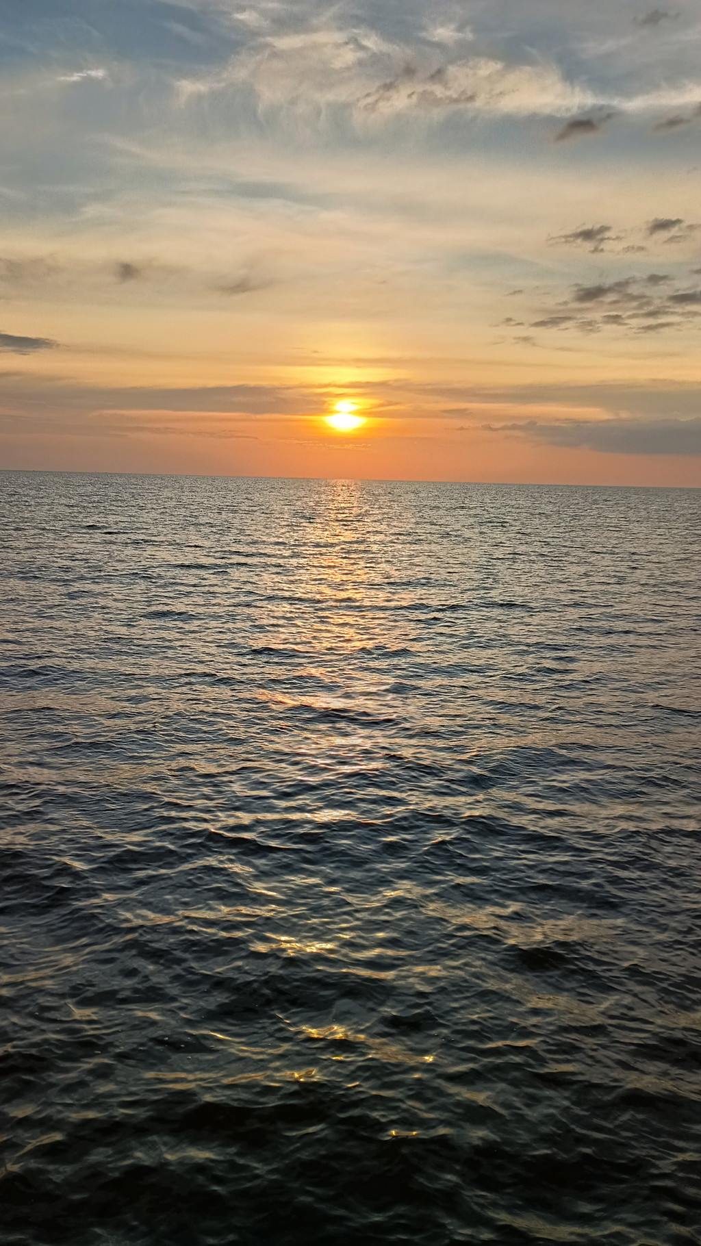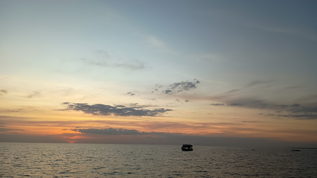 今日の日の入りの予定時刻は17時40分前後、約30分前になったタイミングで、再びボートに乗船し、湖に沈む夕暮れを鑑賞に向かいました。今日は若干雲がある状況ですが、夕日はハッキリ見える状況です。前方に見える船のシルエットが良い景観を演出しています。夕日が徐々に沈むにつれ、景観が少しずつ変化していく様子が大変美しく、良い経験をさせてもらいました。