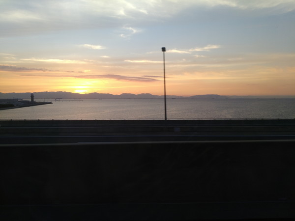 地元からJRと高速バスで名古屋に移動し、名鉄名古屋駅から中部国際空港行きの電車に乗ります。名古屋は通過するばかりで降り立つのは初めてなので新鮮な気分です。特急料金が不要な準急を利用、50分程度で到着しました。途中、セントレアのある常滑市内に入ると、ちょうど夕暮れ時だったので、車窓から綺麗な夕日を見ることができました。