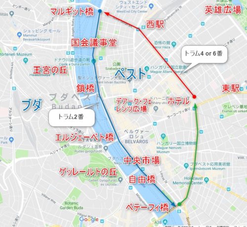 トラム6番に乗り、ホテル前のトラム停留所からマルギット橋のたもとにある停留所「Jászai Mari tér」まで移動します(赤線:約10分)。