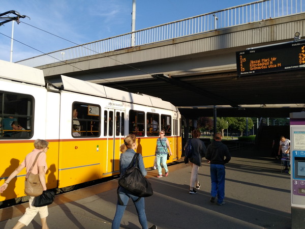 少し離れた場所にトラム2番の停留所があります。トラム6番が輸送力を重視した最新式の車両(シーメンス製)だったのに対し、こちらは地元ハンガリーのガンツ社製で一回り小さくレトロなデザイン、周囲の建物ともマッチしています。車両自体は新しいので今でも観光仕様として製造しているのでしょうか?
