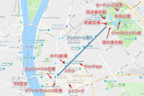 ブダペストでの食事は専らスーパーで買ったもので済ませていたのですが、1回ぐらいはレストランで食事しておこうかなと「Frici Papa」というお店に向かいます。ホテルから近く、安くて美味しいとblogで紹介されていました。googleマップの口コミ評価も高く、一人旅の観光客も結構利用しているようです。