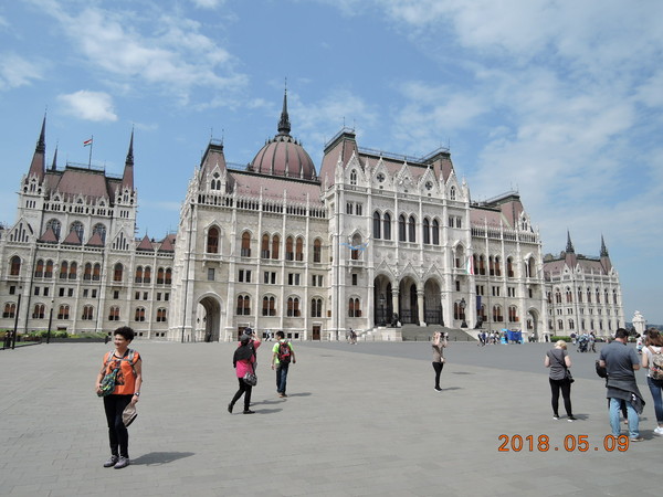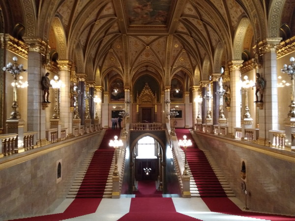国会議事堂は1885年に建設が始まり、17年の歳月をかけて1902年に完成しました。最大の見どころはドームホール(Dome Hall)の王冠と衛兵の交代です。周囲には歴代のハンガリー国王の像が飾られており、イシュトヴァーン1世やマーチャーシュ1世、ハプスブルク家のマリア・テレジアの像もありました。残念ながらドームホール内は撮影禁止でした。