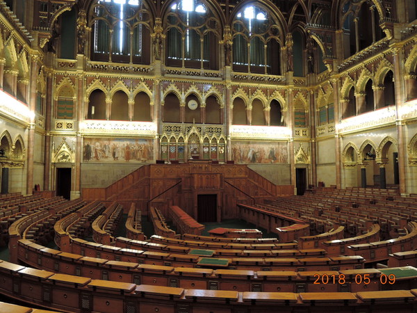 ハンガリーは現在一院制で、国会は旧下院で開催されます。この部屋は国際会議やミーティングに利用されています。また、暖房の仕組みがユニークなんだそうです。