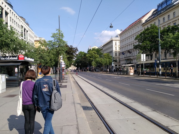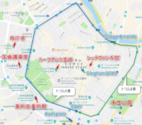 ウィーンにはリンク大通り(Ringstraße)と呼ばれる旧市街を囲む環状道路があり、主要な観光スポットはリンク内側や周辺に集中しています。リンク沿いにはトラムが運行しており、「地球の歩き方」ではウィーンに着いたらまずこれに乗って市内の見所を一通り眺めることをオススメしています。停留所「Oper」でトラム1番に乗り、「Schwedenplatz」でトラム2番に乗り換えて再び「Oper」に戻るルートになります。
