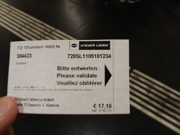ウィーン中央駅は地下鉄1号線(U1)と接続しています。案内表示に従って地下鉄駅「Südtiroler Platz駅」に移動し、入口前の自動券売機で72時間フリーパスを購入します(17.1ユーロ)。これがあれば72時間ウィーン市内の地下鉄、路面電車、バスが乗り放題です。ブダペストと同様、ウィーンの地下鉄も改札がありません。購入したフリーパスは入口の打刻機で刻印する必要があります。フリーパスの場合は最初の1回だけ刻印します。ブダペストでは地下鉄駅の入口や車内で何回か乗車券チェックがあったのですが、ウィーンでは全く遭遇しませんでした。