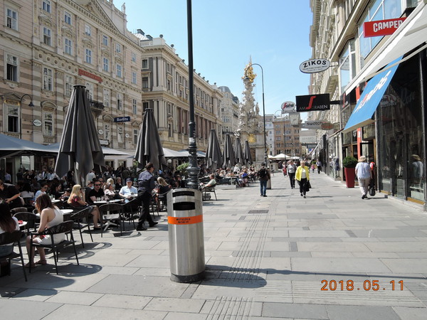 しばしの休憩後、ウィーン観光へ出かけます。今日のお目当てはホーフブルク王宮です。地下鉄U3で「Stephansplatz駅」に移動します。地上に出るとグラーベン通り(Graven)という中心部に出ます。雰囲気のある通りでウィーンに来たことを実感します。お洒落なお店が建ち並び、至る所にカフェがあります。観光のメッカなので大勢の観光客で溢れかえっていました。