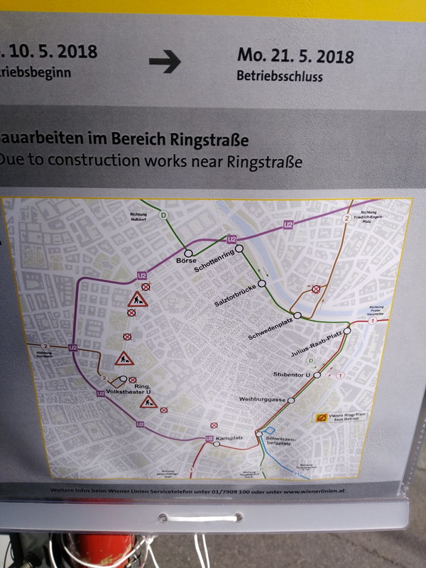 地下鉄M1で「Karlsplats駅」に移動し、徒歩約5分で停留所「Oper」に到着です。到着後、しばらくトラム1番が来るのを待っていたのですが一向に来る気配がありません。おかしいなと思って周囲を見渡したところ、何やら注意書きらしきものがあります。どうやらリンクの一部区間が工事中になっていて迂回運行している模様。工事期間は5/10~21と始まったばかりでウィーン滞在中と重なってしまいました。これによりリンク1周の試みは達成できませんでした(残念!)。