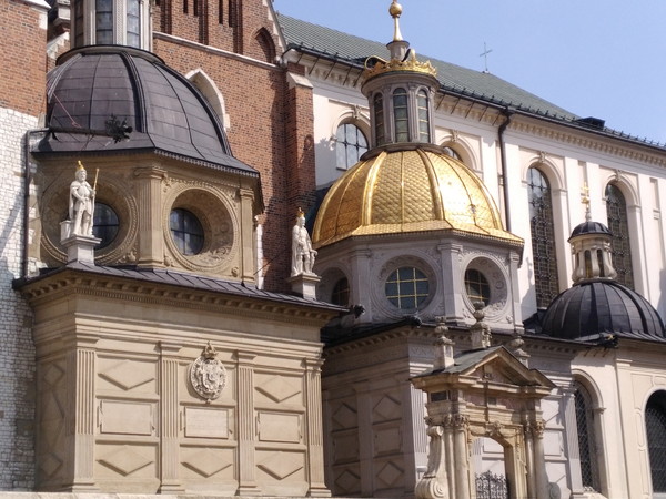 外庭で一際目立つ建物がヴァヴェル大聖堂です。歴代国王の戴冠式が執り行われ、地下には墓所があります。金色のドームが目を引きますが、これは「ジグムント・チャペル」と呼ばれるものでルネッサンス建築の傑作だとか。