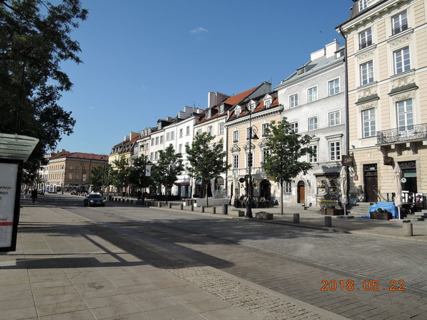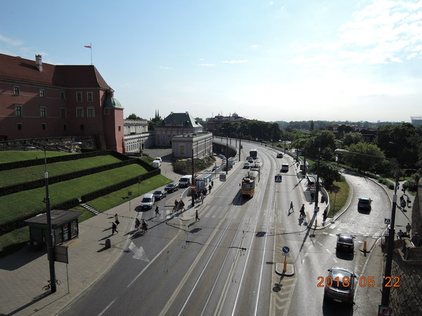 市バスに乗車すると「新世界通り」を北に進み「クラクフ郊外通り」に入ります。約10分でバス停留所「Pl.zamkowy」で降車します。クラクフ郊外通り沿いには美しい建物が建ち並んでいます。