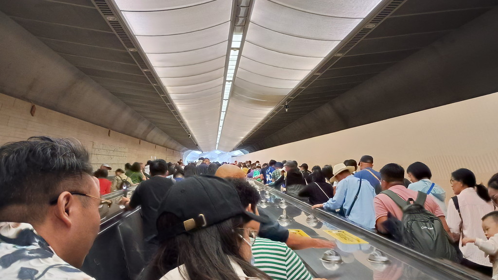 プラットフォームは地下の相当深い場所に建設されており、地上に上がるまで長いエスカレーターを2回乗り継ぎ、かれこれ10分近く掛かりました。下から仰ぎ見る長いエスカレーターの景観は中々迫力がありました。