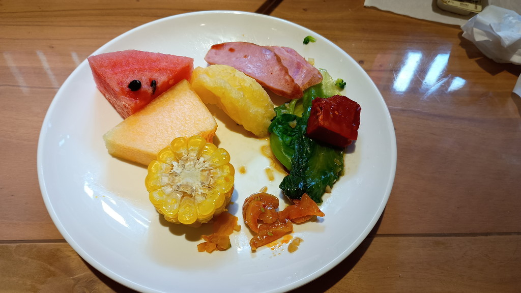 7時半を過ぎたので、1階ロビー近くの食堂スペースにてビュッフェ形式の朝食を頂きました。メニューは特に変わり映えしませんが、今日はご当地料理と思われる1品料理を口にしました。2枚目の写真の野菜炒め上に乗っている、赤くてサイコロのような立法体の食べ物です。後から調べても何という料理かは分かっていません。この時は、豆腐のような食べ物だと思って一気に口に入れてしまったのですが、これが大失敗で、かなり強烈な味で一瞬戻しそうになりましたw 辛味と酸味が非常に強く、味噌を固めたような食感で、何とも表現し難い食べ物でした。今から振り返ると、少しずつ口に入れればそれなりに美味しく頂けた気もします。