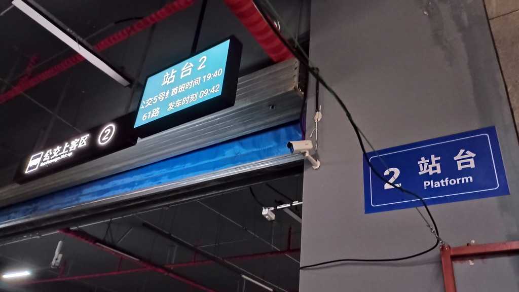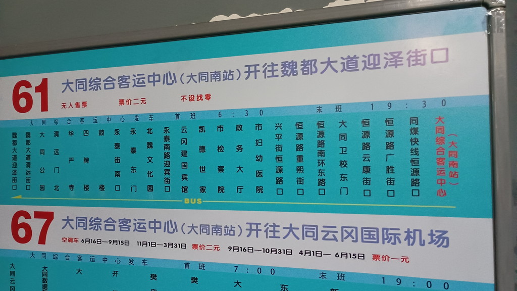 列車は予定通り大同南駅に到着しました。半分以上の乗客はここで降りました。今日から宿泊するホテル(旅館)は「大同古城」の中にあり、大同南駅から北西に約8kmの位置にあります。時間に余裕があったので、大同古城へは61路バスを利用して移動しました。バスは大同南駅に隣接するバスターミナルから出発しています。地図アプリで大同古城を目的地にして検索すると、バス停まで1km近く歩くルート(駅の外を歩くルート)が表示されますが、駅からバスターミナルへは地下通路が整備されているので、こちらを通って移動するのが効率的です。改札を出た後は左(西)に進み、地下に降りるエスカレーターがあるので、後は標識に従って移動するだけです。感覚的には500mほど歩いてから地上に上るとバスターミナルが見えました。61路のバス停(2番プラットフォーム)は分かりやすい位置にありました。心配していた天気ですが、丁度バス停に着いたタイミングで、強い雨が降り始めました。