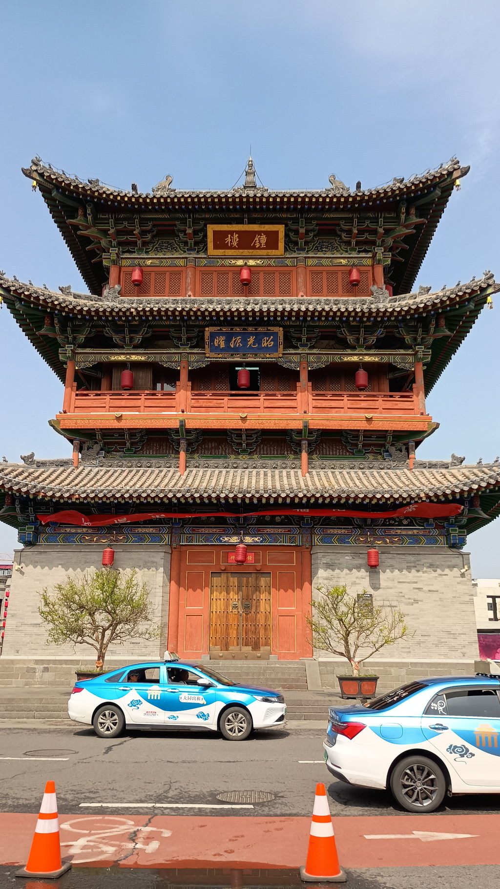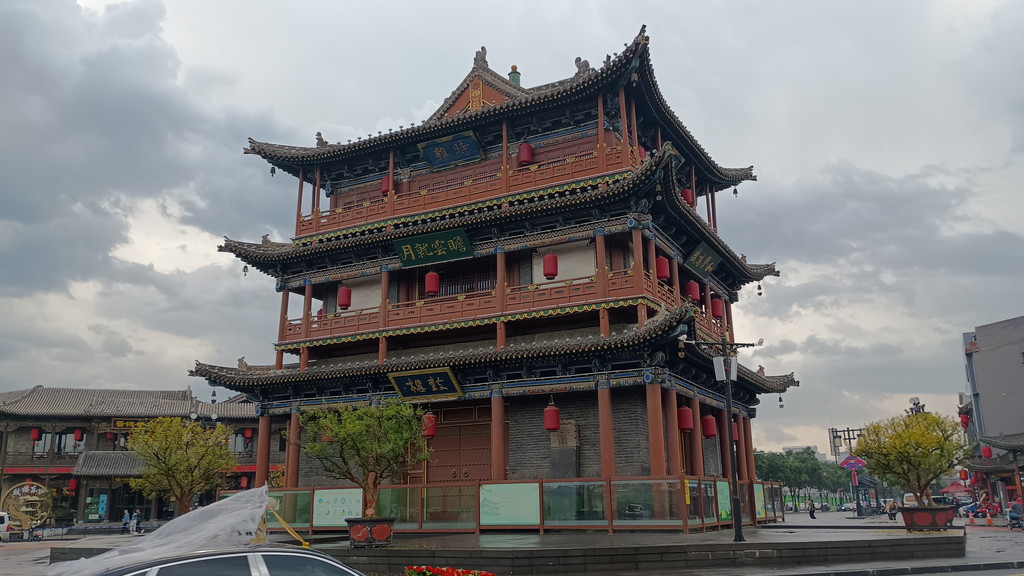 バス停近くの交差点の中央には「鼓楼」が立っていました。明の時代に建てたのが最初で、後に再建や補修が行われたようです。私が今立っている永秦街や、東西の大通り「清遠街(清远街)」にはロータリー交差点が何ヶ所かあり、中央には楼閣などが建っているのも見どころの1つです。